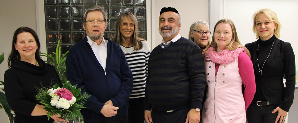 Jorma. K. Ahonen on tehnyt vuosikymmeniä työtä holokaustin uhrien ja Israelin hyväksi. Yitschak Naki kiitti häntä vieraillessaan Suomessa. Kuvassa myös vasemmalta Noam Eliezer Finlandin väkeä eli puheenjohtaja Marja-Riitta Nuikkinen (vas.) sekä Sisko Oittinen, Ritva Ala-Heikkilä, Suvi Virtanen ja Minna Ala-Heikkilä.
